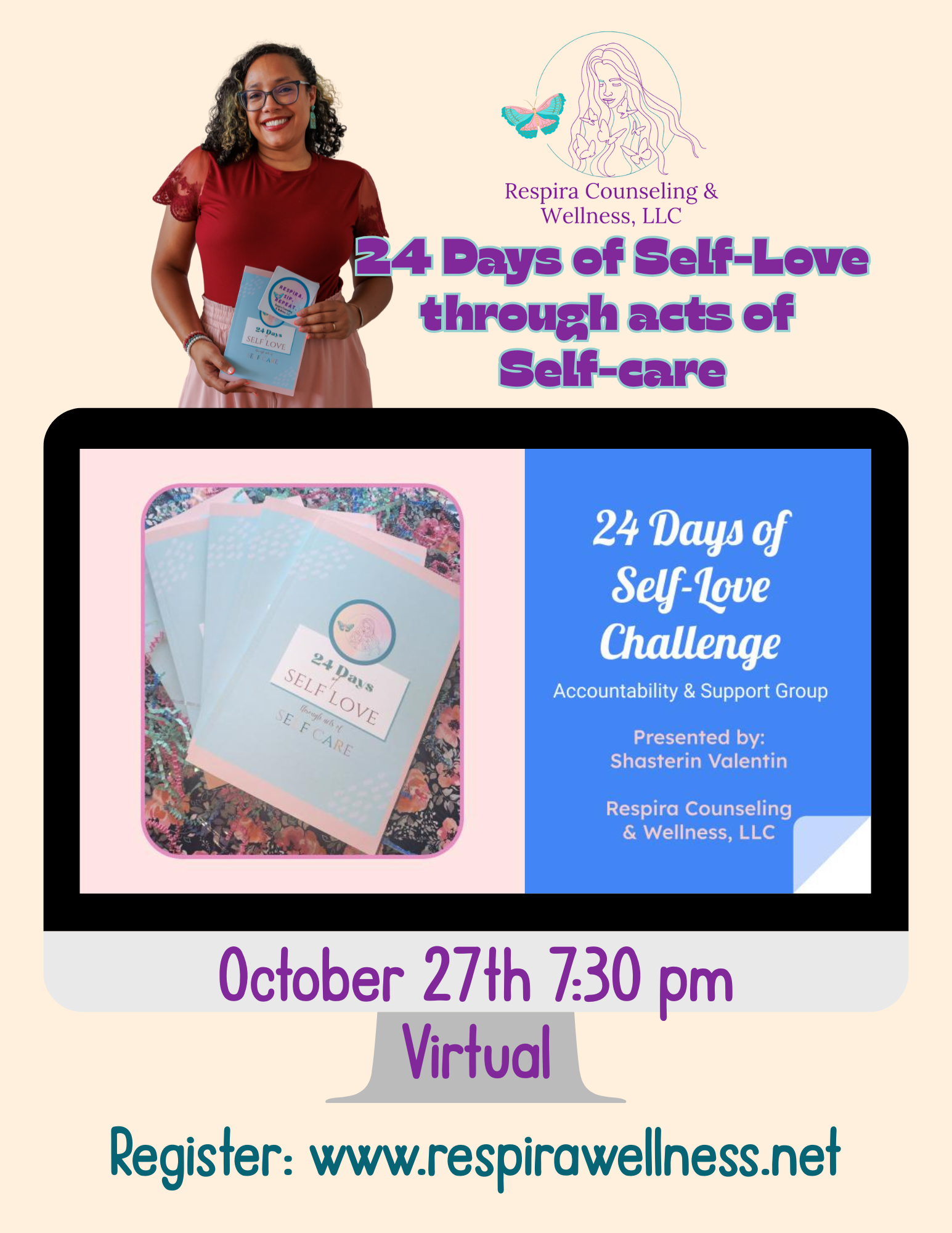 We invite you to join us on this 24 Days of Self-Love challenge, where you will receive the support of an accountability group as well as a safe space to connect with other like-minded individuals. This virtual group will meet for an hour a week for 6 weeks as we work together through the workbook 24 Days of Self-Love through acts of Self-Care, published by Shasterin Valentin, LCSW. The group aims to provide support in addressing potential barriers to self-care, build your empowerment tribe, and set the momentum for healthy lifestyle changes, promoting emotional wellness.